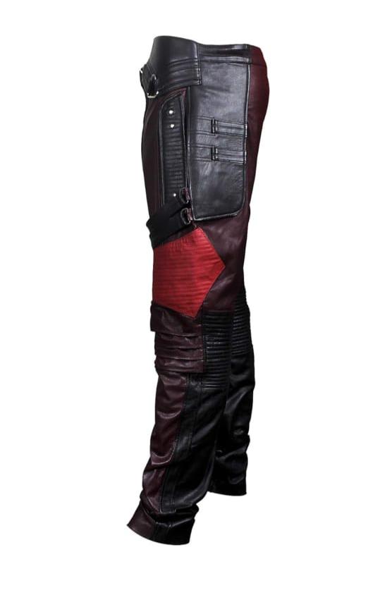 The image displays Peter Quill's Star-Lord costume pants from Guardians of the Galaxy. These pants are typically made from faux or genuine leather and feature a distinctive maroon color with red accents on the thighs. They are designed for cosplay, Halloween, or Marvel-themed events, reflecting the iconic look of the character in the Marvel Cinematic Universe.