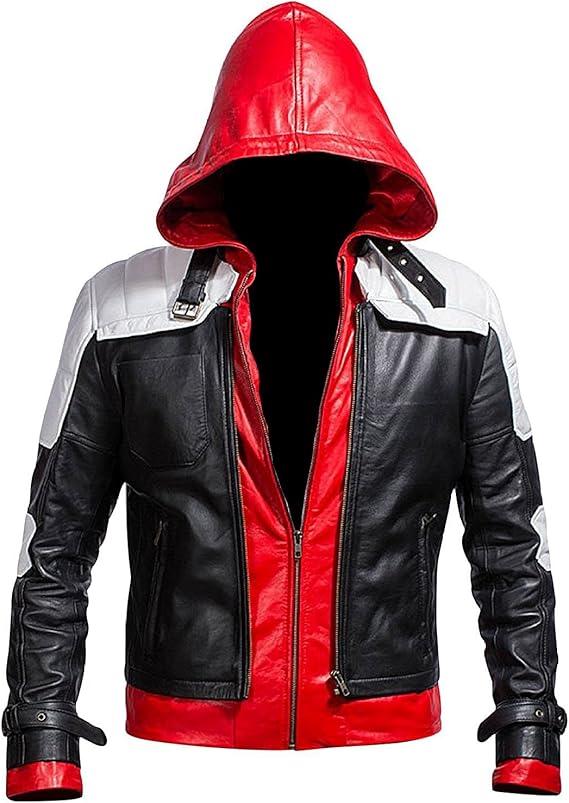 Red Hood inspired jacket in genuine or faux leather. Bold black, white, and red design. Perfect for cosplay, conventions, or casual wear.
