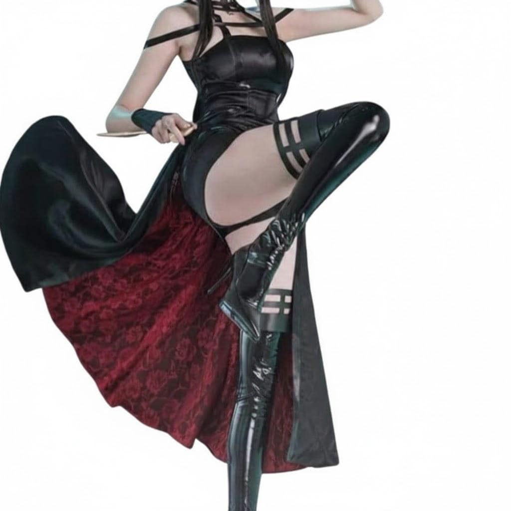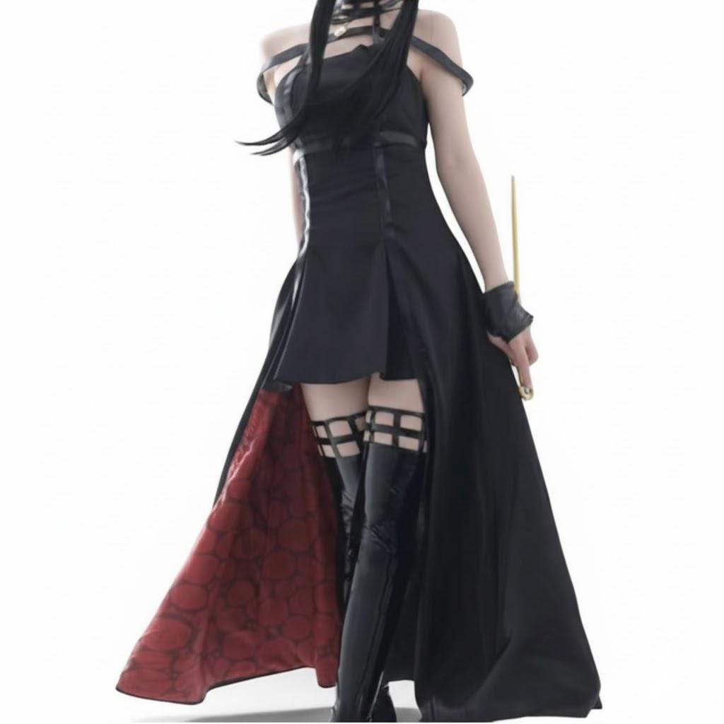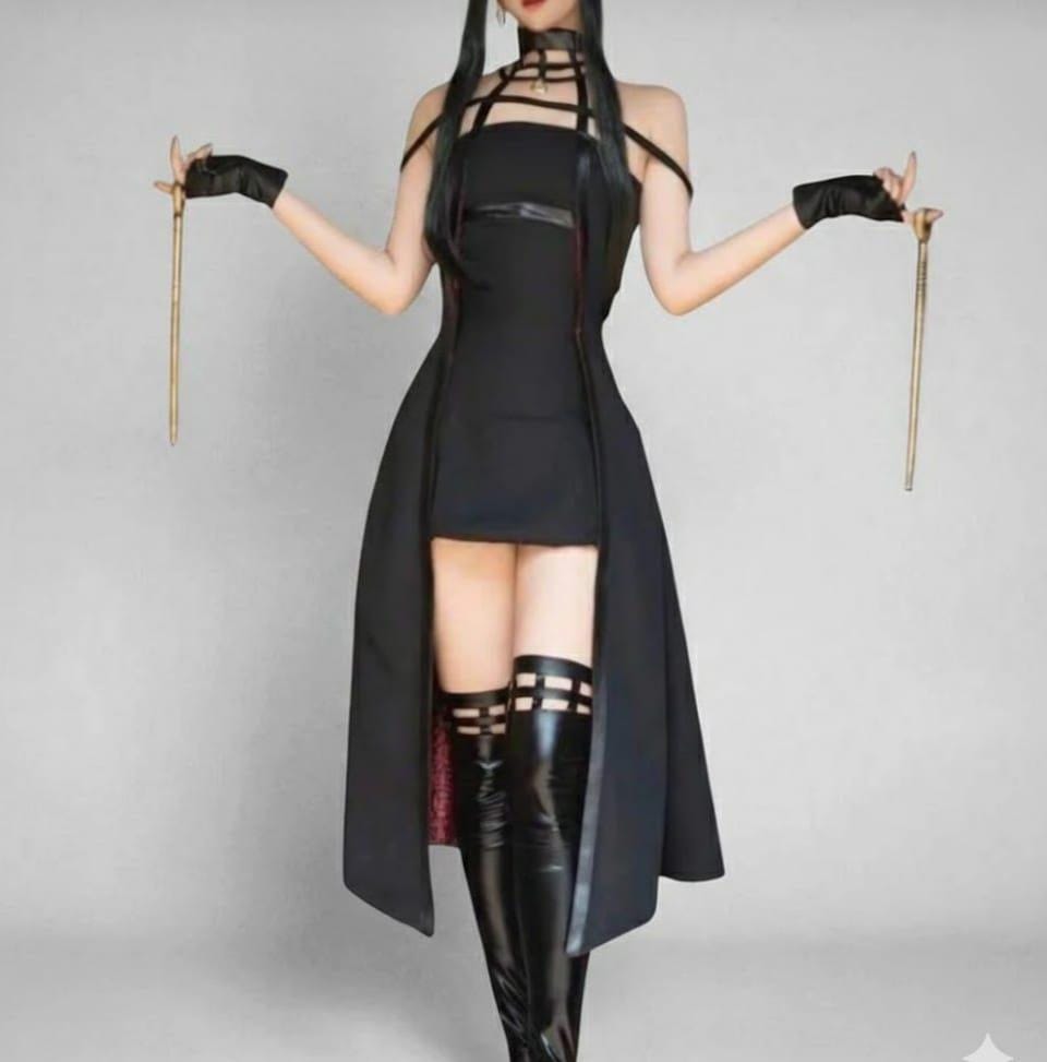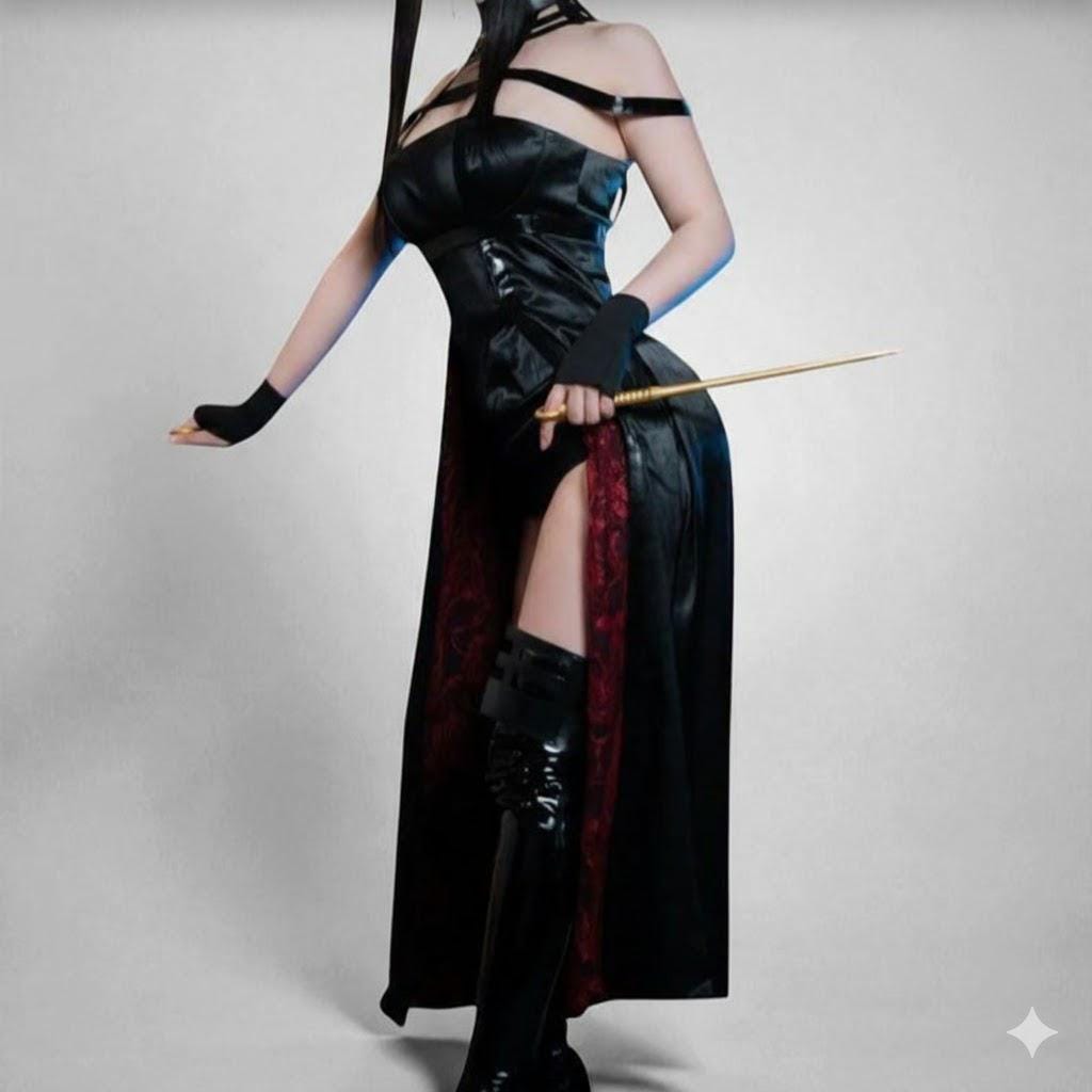 Step into the role of a mysterious femme fatale with this elegant black cosplay outfit, crafted to bring sophistication and strength to your look.
