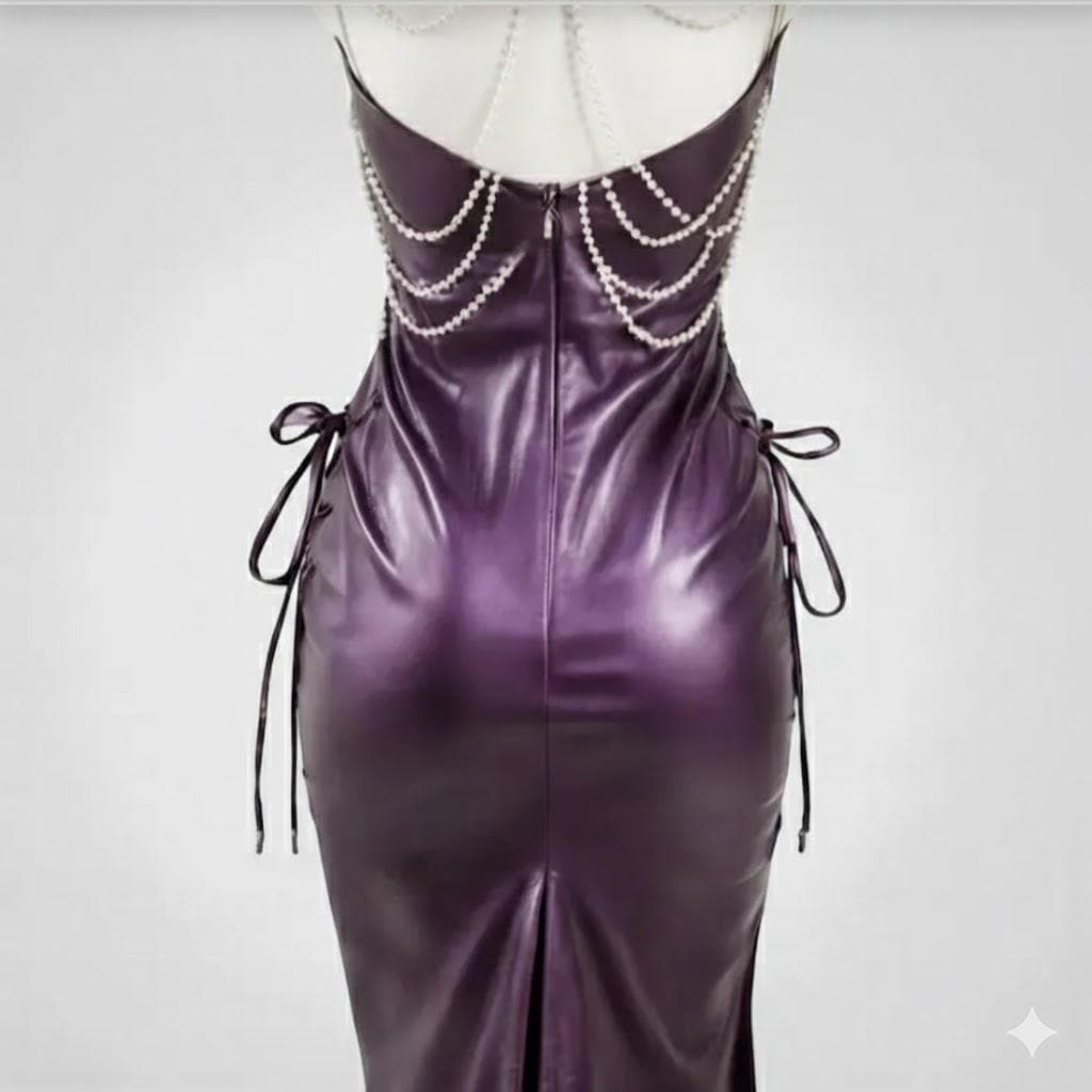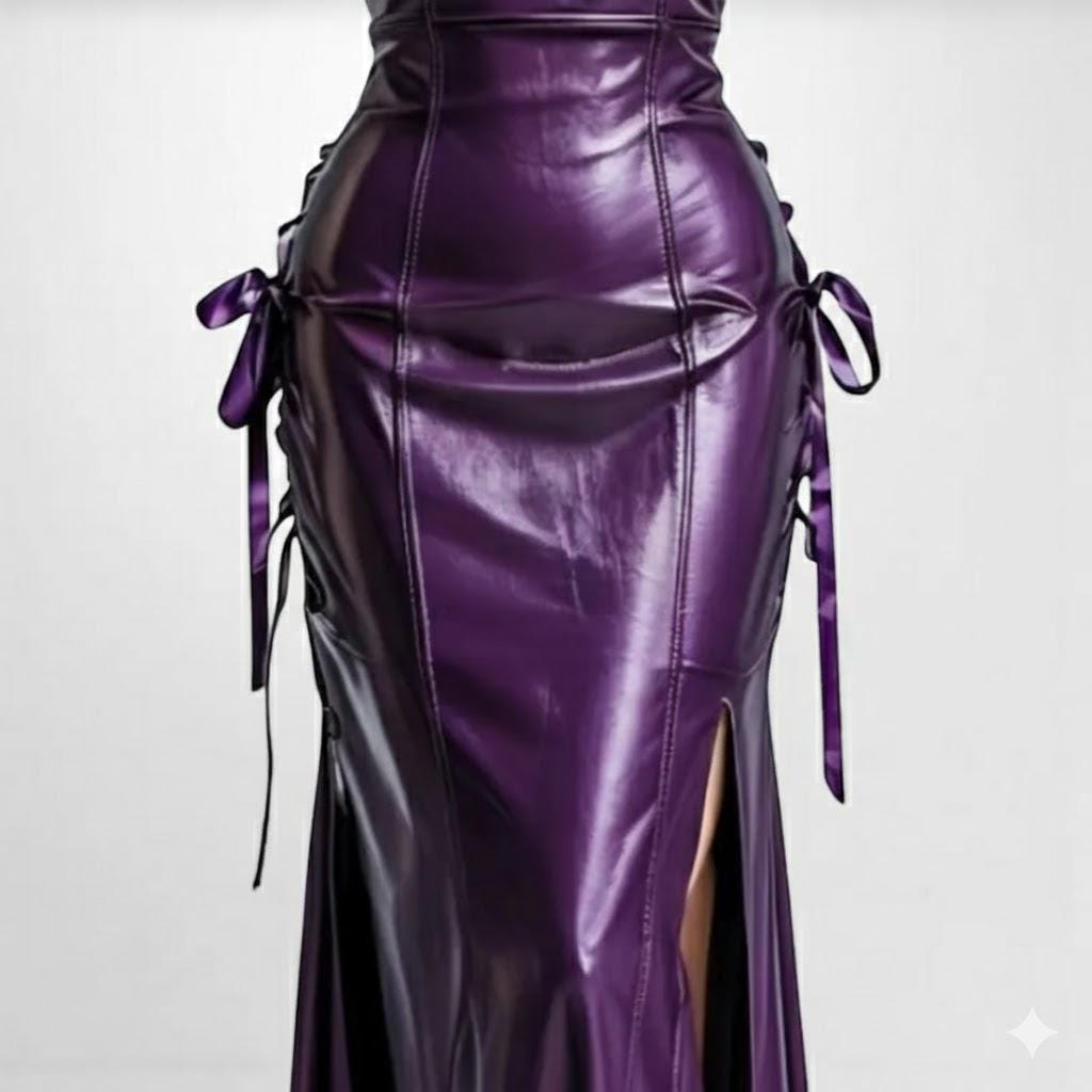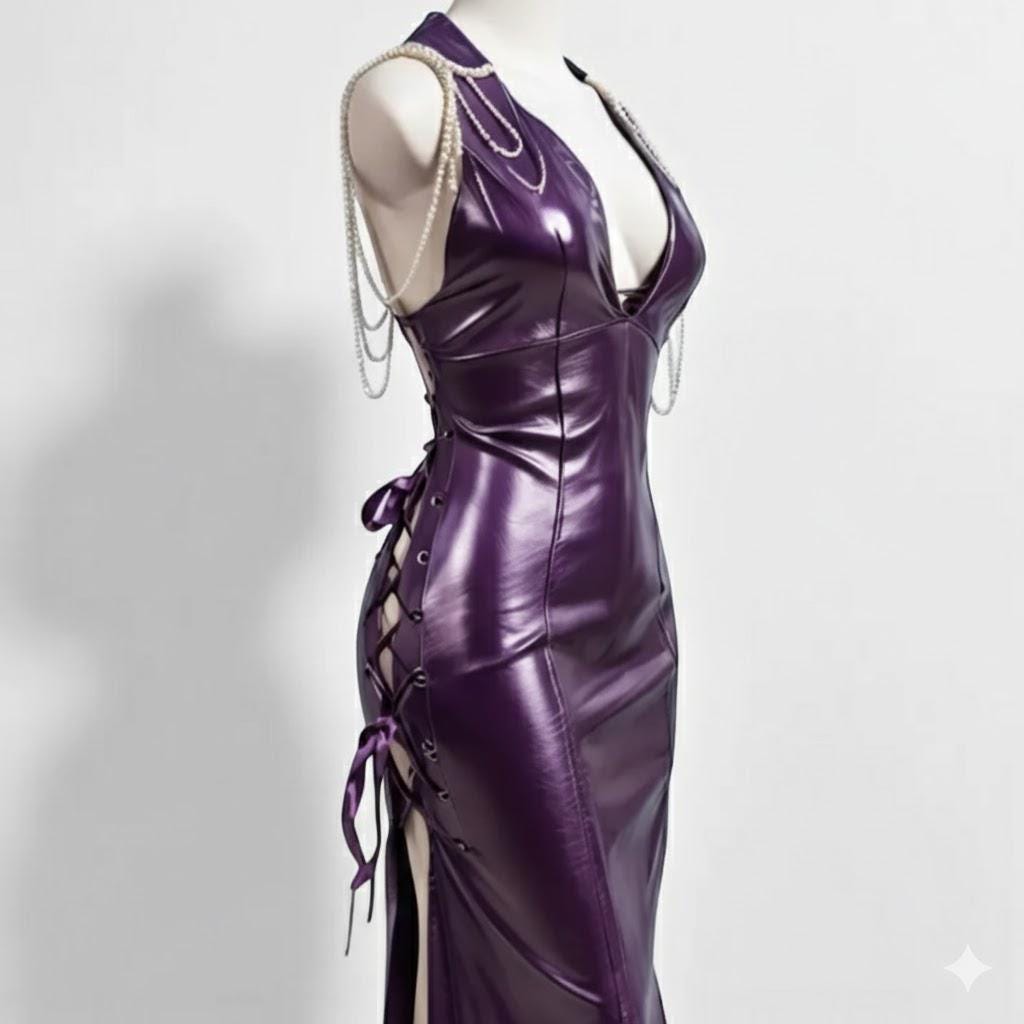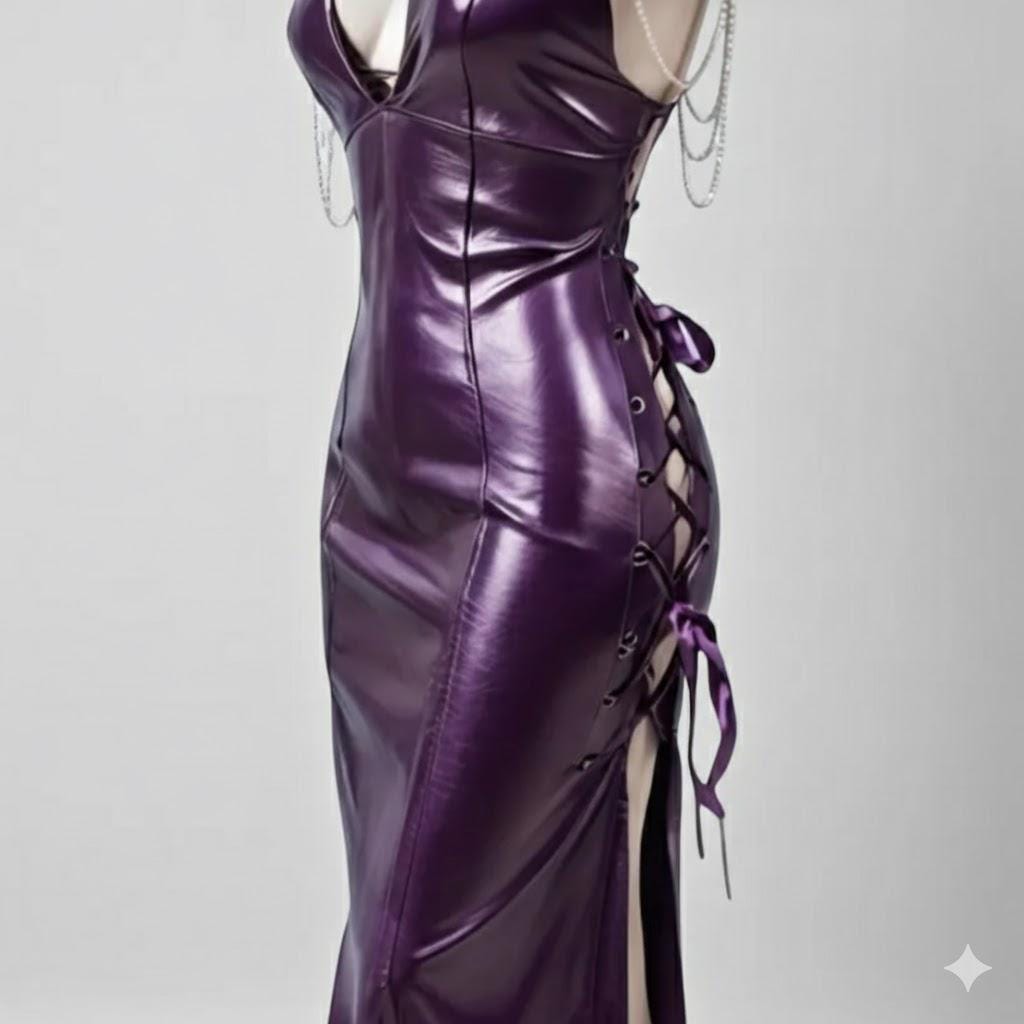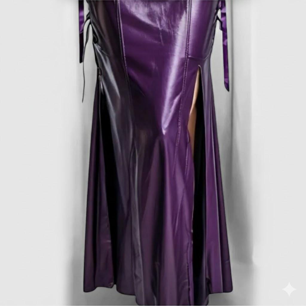 Unleash your inner femme fatale with this stunning purple cosplay dress, designed for bold and confident women who love to stand out. Made with glossy faux leather fabric, this gown combines elegance and edginess, making it the perfect choice for cosplay, conventions, and evening parties.